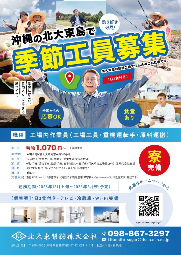 北大東製糖株式会社では、製糖工場の稼働期間に合わせて全国から仲間を募集しています。